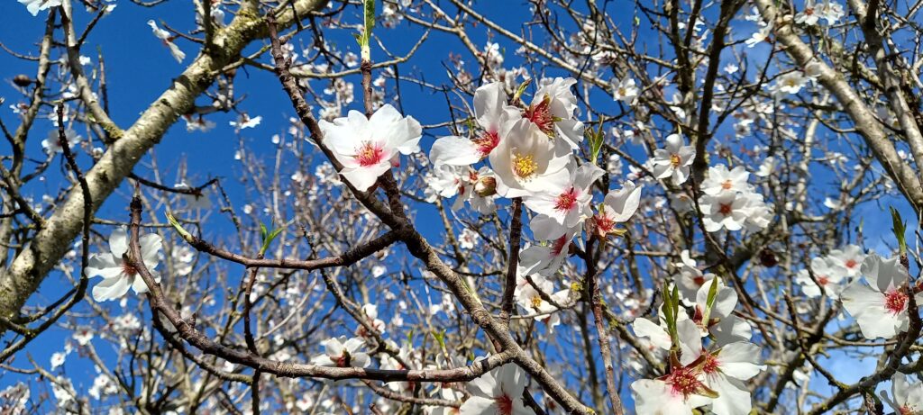 Mandelblute. Sonnige Tage und blaue Himmel.
